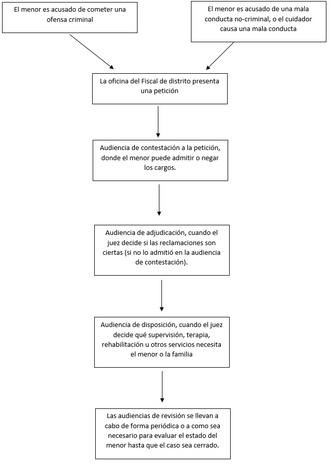 Los casos de delincuencia comienzan cuando se acusa a un menor de haber cometido un acto que se consideraría delito si fuera un adulto. Al menor acusado se le designa un abogado para que lo represente, y la oficina del fiscal del distrito presenta una petición con estas alegaciones. Luego hay una audiencia, llamada audiencia de respuesta, donde el menor puede admitir las alegaciones o negarlas. Si el menor niega las acusaciones, se fijará una audiencia de adjudicación. En la audiencia de adjudicación, la fiscalía debe tratar de probar que el menor cometió los actos de los que se le acusa. Si el juez determina que el menor cometió estos actos, se fijará otra audiencia, llamada audiencia de disposición. De manera similar a la sentencia en un tribunal de adultos, el juez decidirá a su disposición qué tipo de tratamiento, supervisión o rehabilitación necesita el menor, por ejemplo, servicio comunitario, restitución, libertad condicional o colocación en un lugar seguro. El tribunal tiene jurisdicción sobre estos casos hasta que el menor alcance la edad de 21 años.